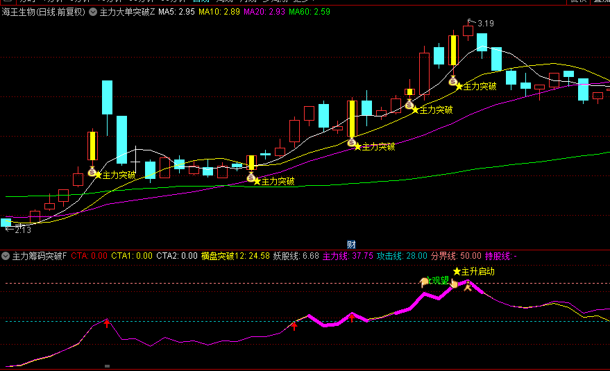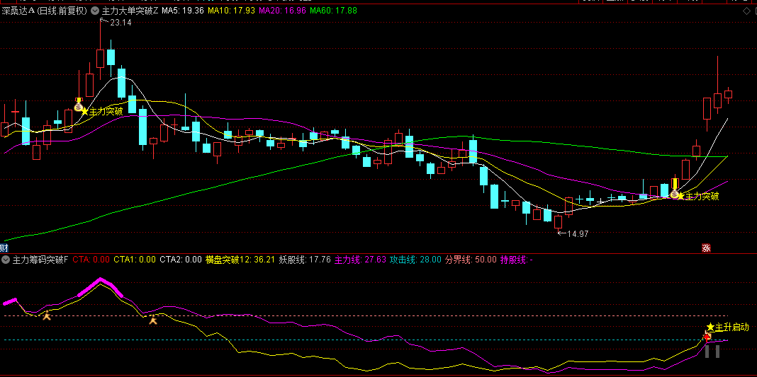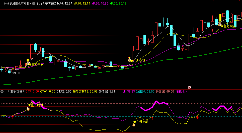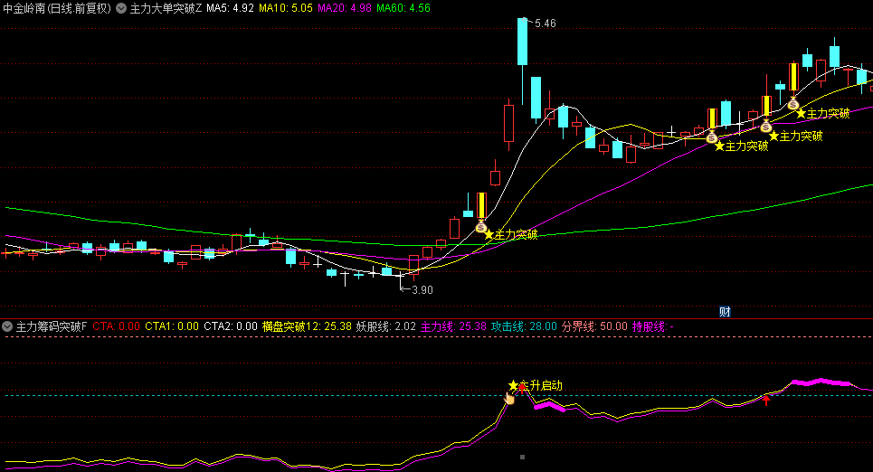 当股价突破近期高点且成交量显著放大时,标志着主力大单突破的信号出现,此时主图会通过黄色K线和★主力突破文字提示投资者关注。