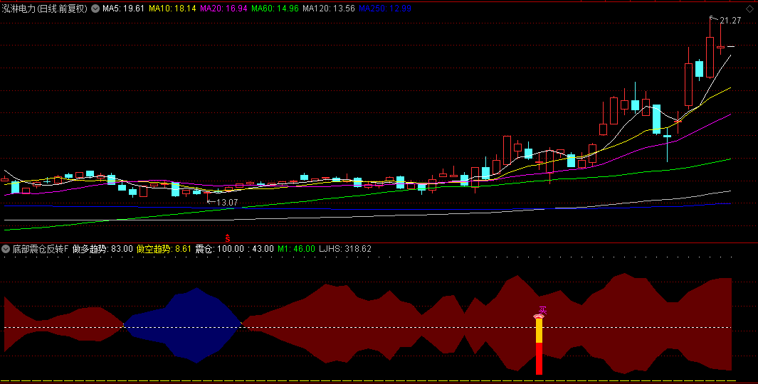 在副图指标中,红黄叠加的柱子往往出现在空头区间,这通常是资金在底部建仓的信号。该柱子通常伴随“买”字标识,表明市场的卖压开始减轻,资金正在慢慢流入。