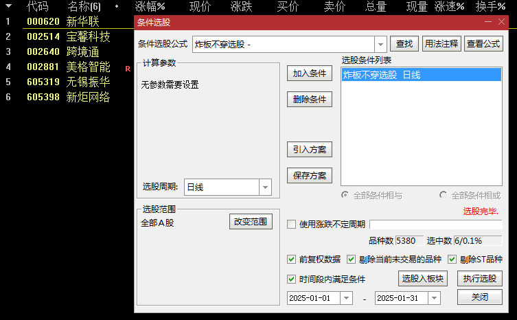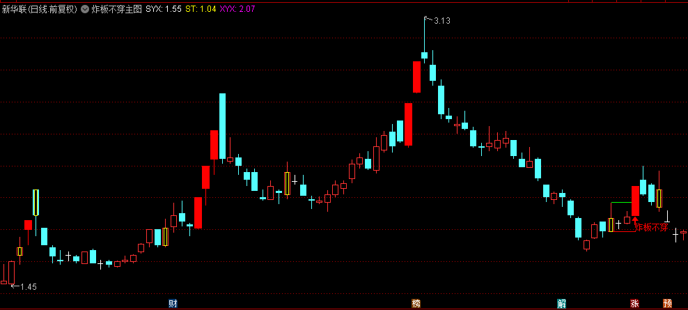 选股:通过选股指标,筛选出符合炸板不穿条件的股票。这些股票在炸板后依然保持强势,后市有较大的上涨潜力。