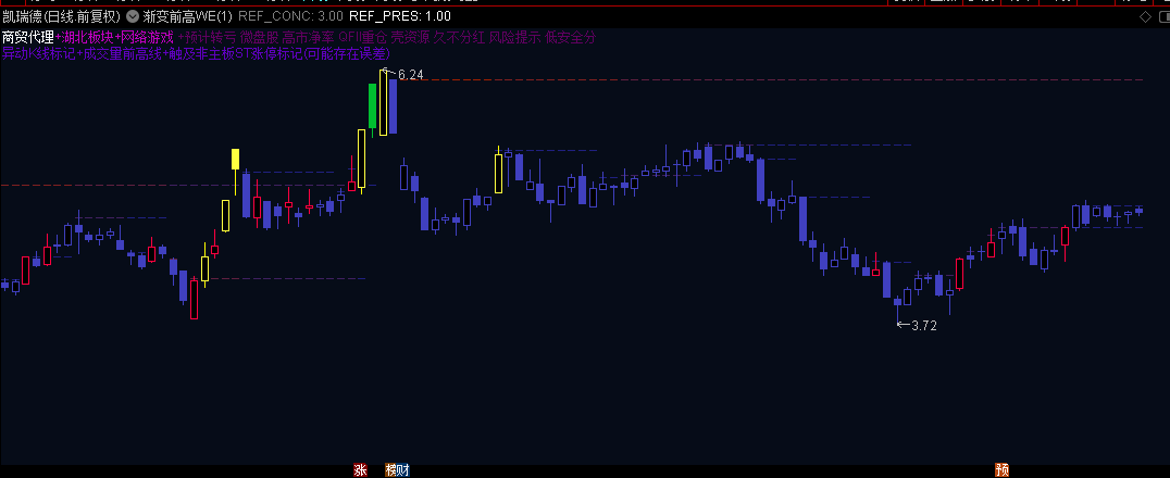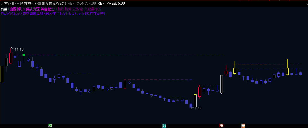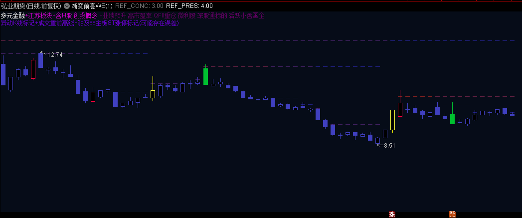 【极简艺术·三木】通达信【渐变前高WE】主图指标,五层渐变前高线+集中度分级+压力值分级+裸k线异动标记!