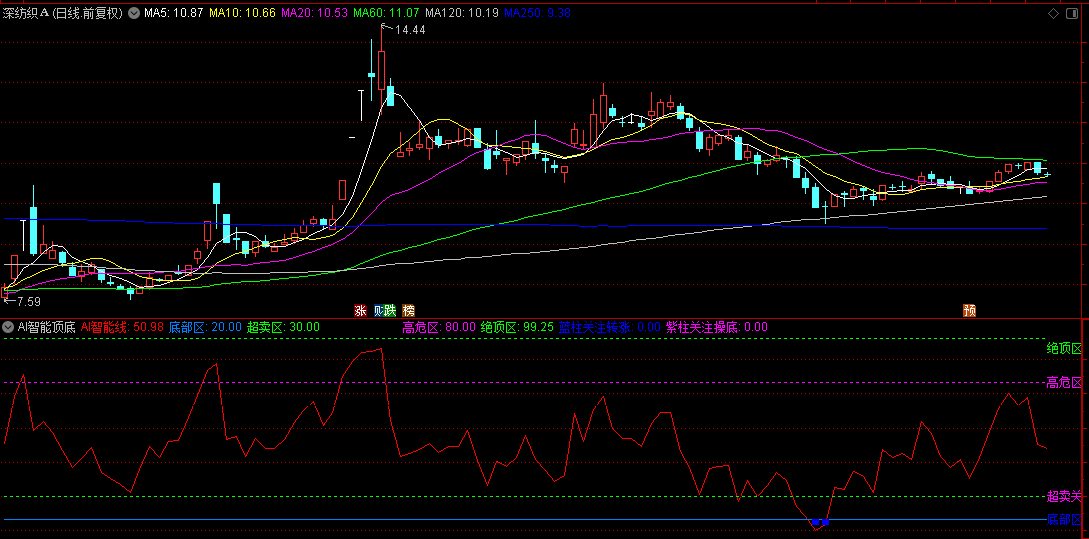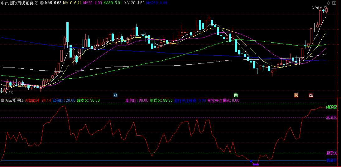 1.指标文字栏:AI智能线:对应数值;底部区:20;超卖区30;超买区:70;高危区:80;绝顶区99.25;蓝柱关注转涨;紫柱关注抄底。