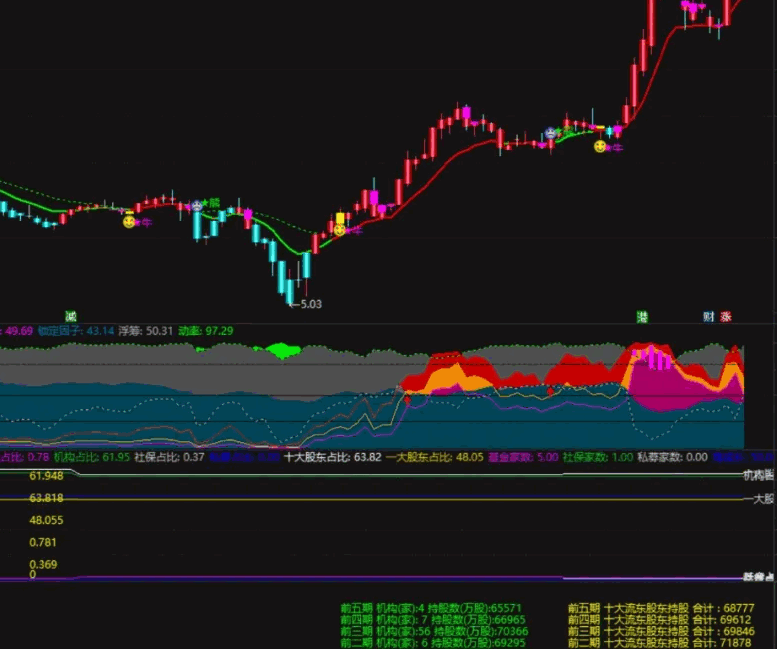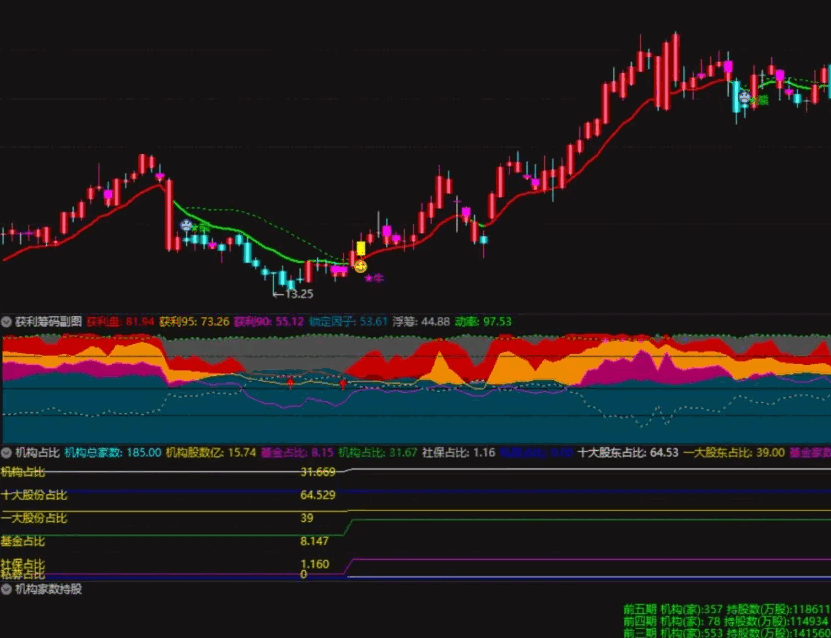 机构持仓占比副图通过多个指标展示了机构投资者的持仓情况,帮助投资者了解市场中主力资金的动向。
