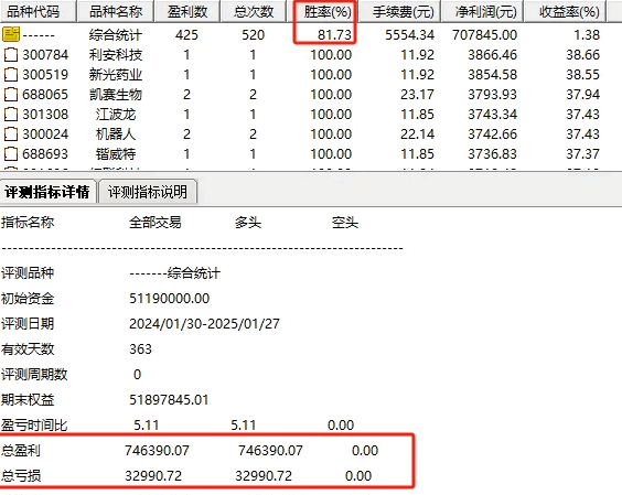 持股周期2天,胜率81%。正向年收益70万;共出手520次。