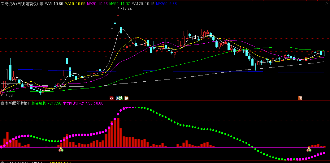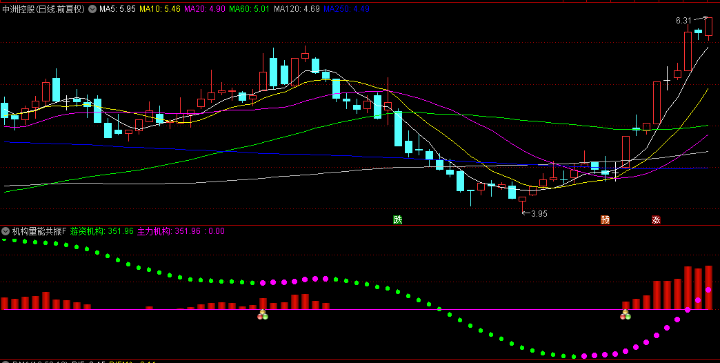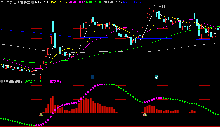 2. 游资机构线:通过指数平滑移动平均线对量能进行双重平滑处理,形成一条变色圆点线。这条线反映了短中期资金波动的高低差,帮助投资者识别资金的短期进出情况。