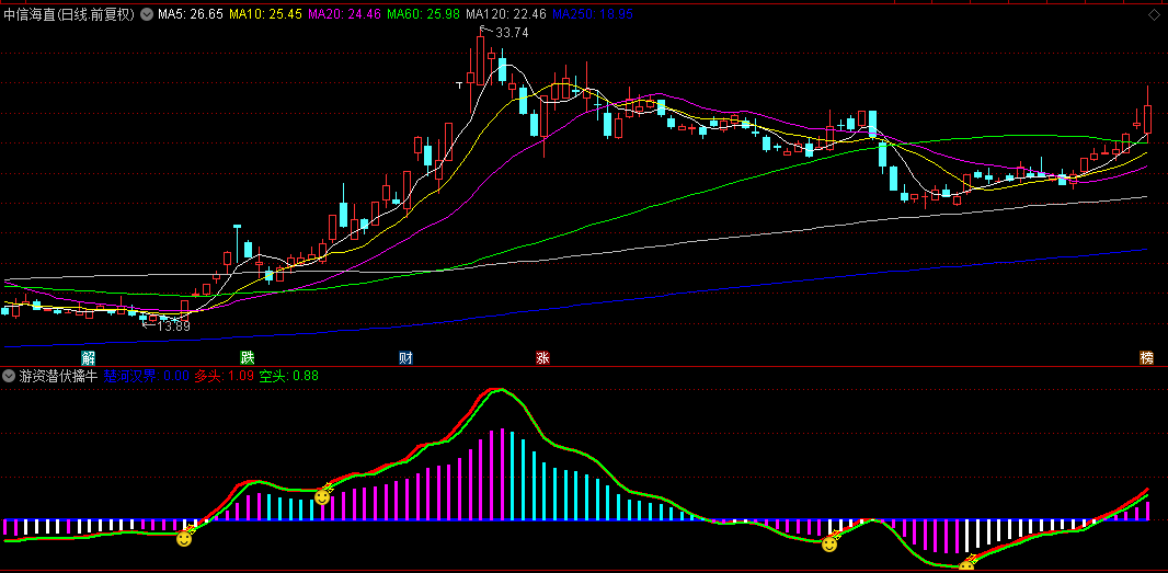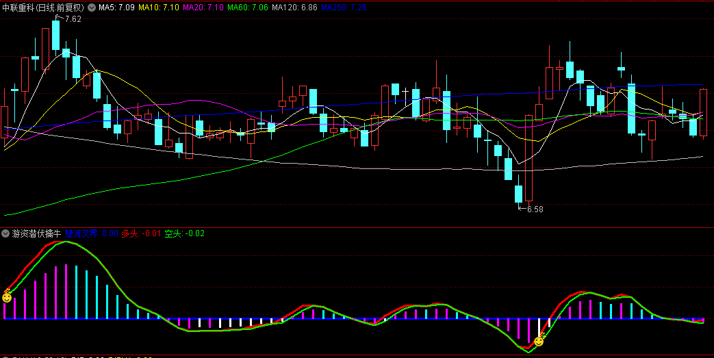 - `空头`信号则以绿色细线显示,反映中期趋势的压制作用。