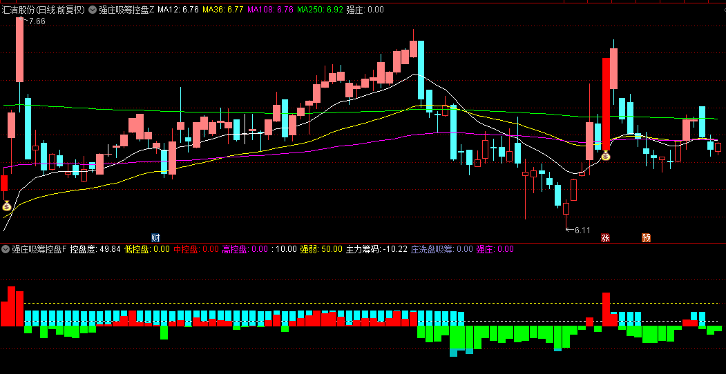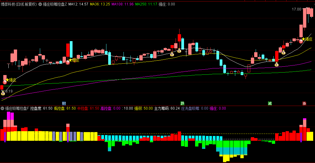当副图首次出现红色柱子并突破强弱分界线时,显示钱袋子信号,表明庄家正在高度控盘。