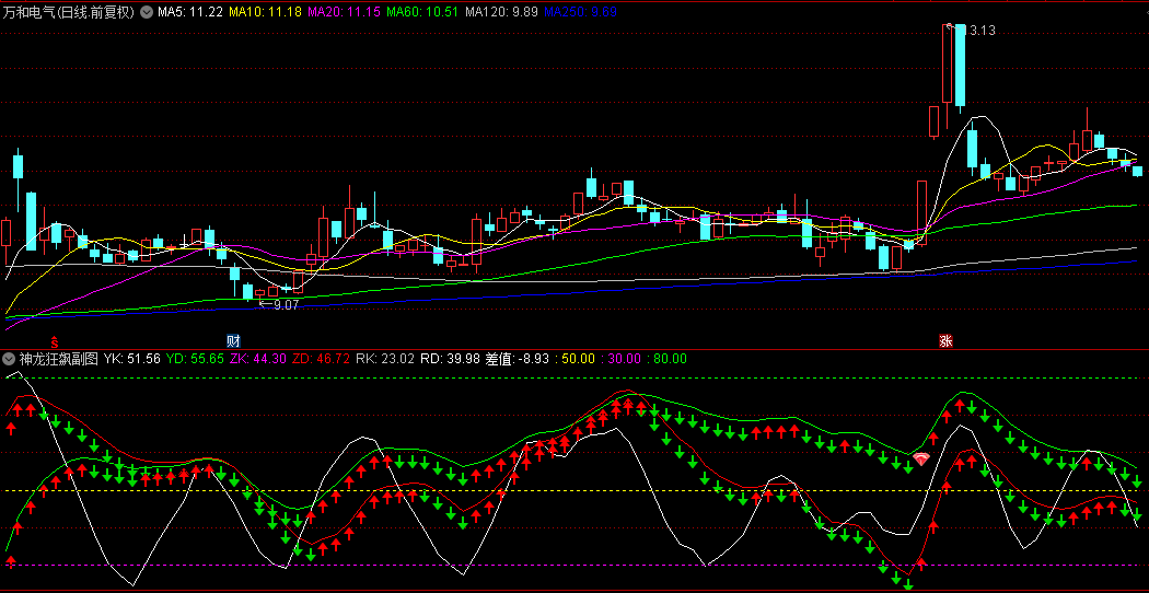 在指标的应用过程中,当周线D值和月线D值形成金叉并向上发散时,系统会自动标记出红色箭头,作为市场趋势向上的明确信号。