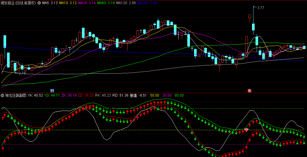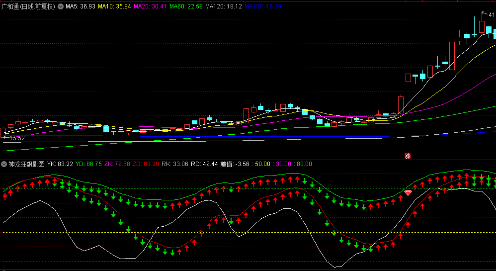 相反,当两者形成死叉并向下发散时,则会出现绿色箭头,暗示市场可能面临调整或下跌的风险。