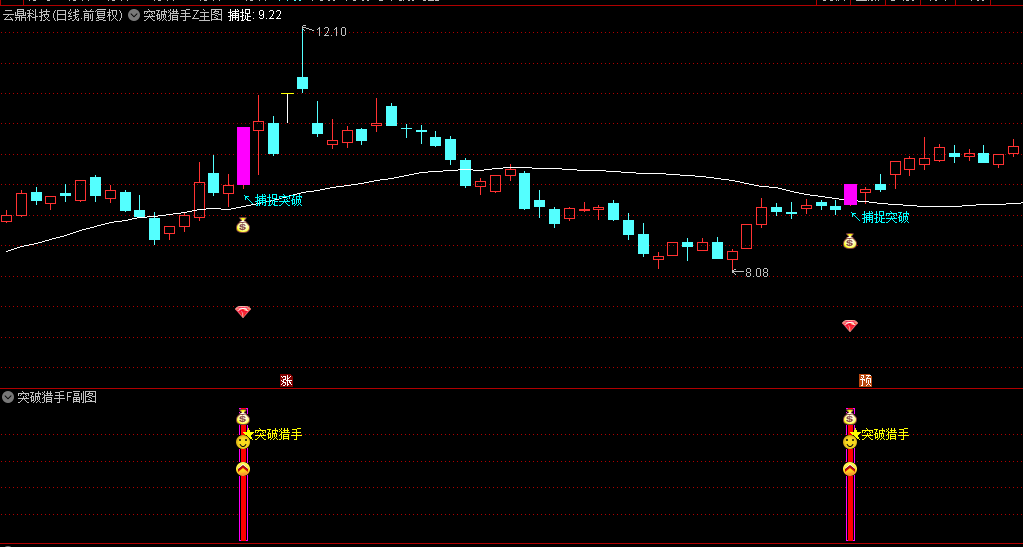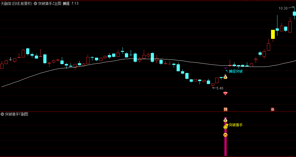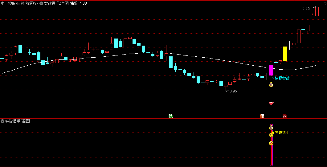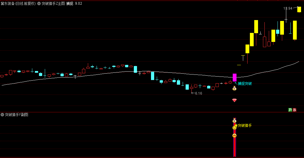 红色柱状图:在突破信号上方标注“★突破猎手”文字提示,并附加图标以增强视觉效果。