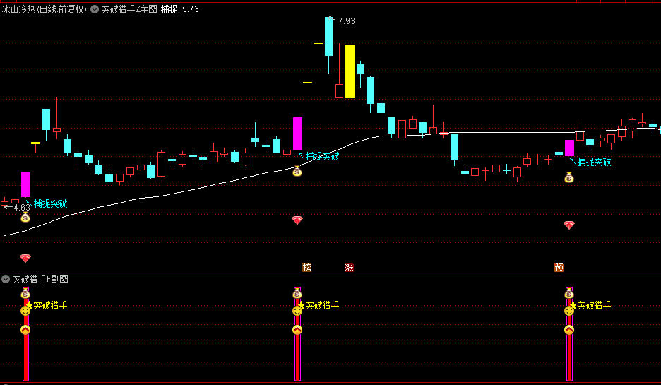 洋红色K线:标记符合突破条件的股票,并在K线下方标注“↖捕捉突破”文字提示。