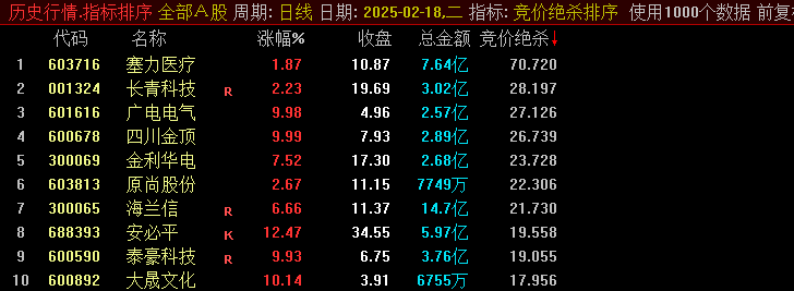 牛市中的应用:在牛市中,市场情绪高涨,资金流动性充足。通过【竞价绝杀排序】指标,投资者可以快速识别出那些在竞价阶段就表现出强劲上涨动力的个股,抓住市场热点,获取超额收益。