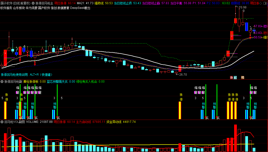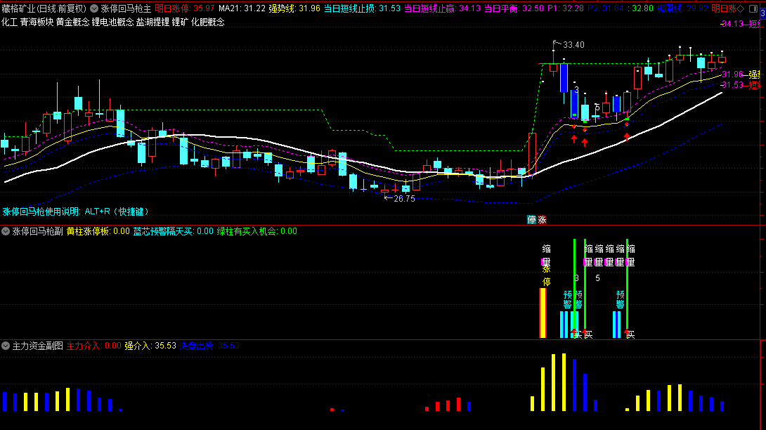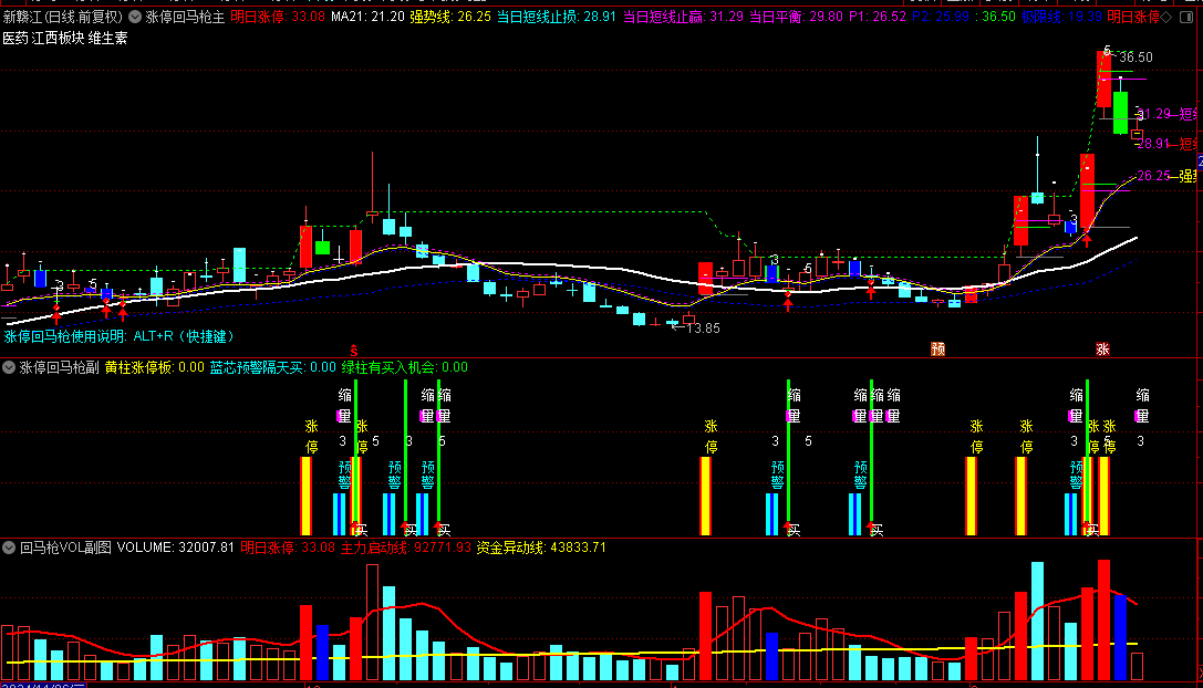 当成交量突破“主力启动线”或“资金异动线”时,副图会通过红色柱状图提示资金异动信号,结合主图的涨停回马枪信号,进一步确认买入时机。