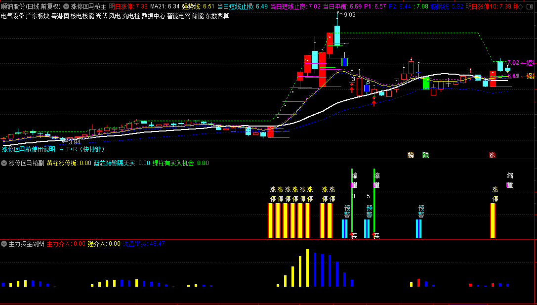 回调信号:当股价在涨停后出现回调,且回调幅度未跌破关键支撑位,主图会通过蓝色K线和绿色柱状图提示低吸机会。