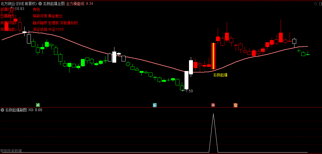 本指标体系完备,不仅包含了一个直观易读的主图,还配备了一个专门用于筛选右侧起爆信号的选股指标,双管齐下,助力投资者精准捕捉市场机遇。尽管指标中融入了未来函数,但这并不妨碍其在实战中的参考价值,它依旧能够为我们的投资决策提供有力的支持。