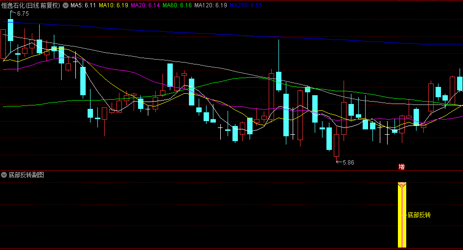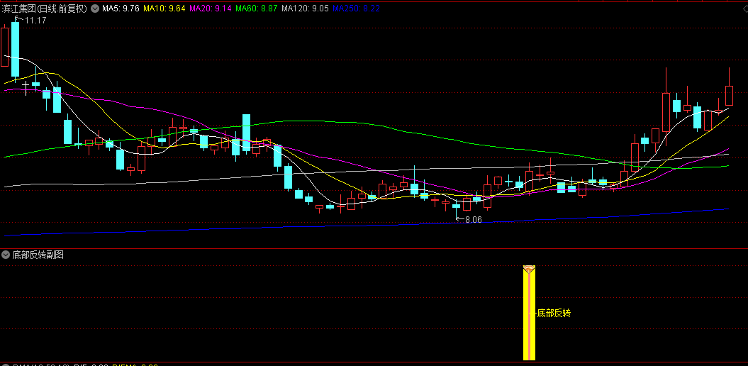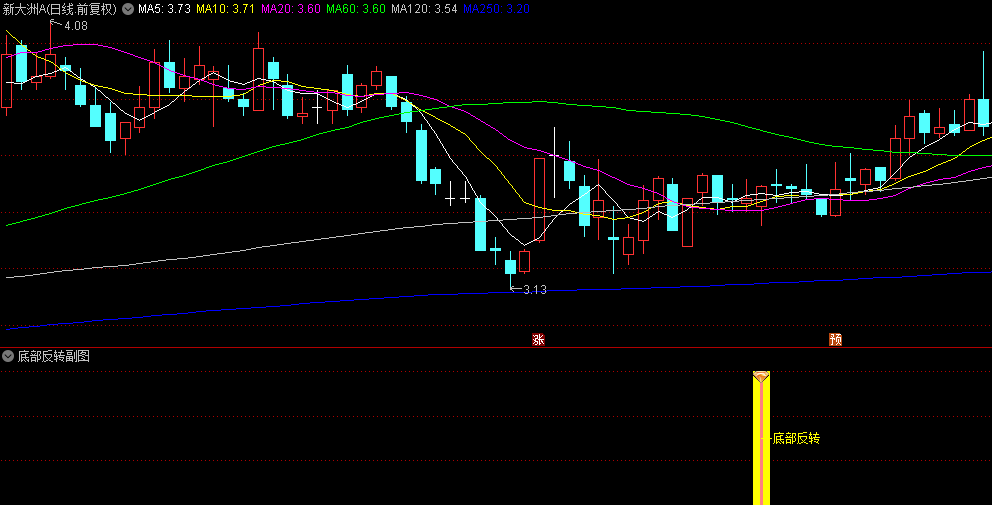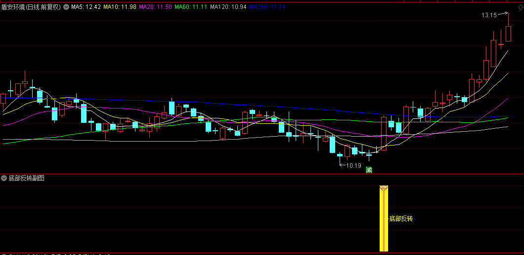 当副图中出现黄色柱状图或“底部反转”文字提示时,表明当前股票可能处于底部反转的关键位置,投资者可以结合其他技术分析工具进一步确认买入时机。