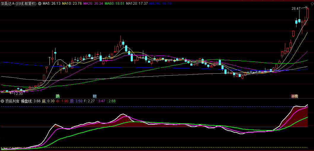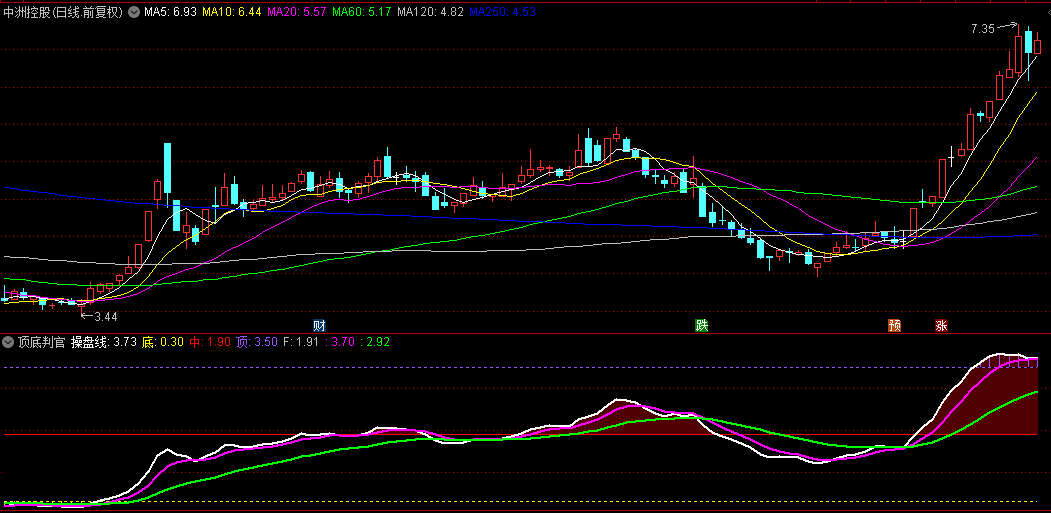 除了白色的操盘线,还设有5日均线{粉色},和21日均线{绿色},也可以根据这些线的金叉死叉和老鸭头形态以及背离形态来决策买卖。