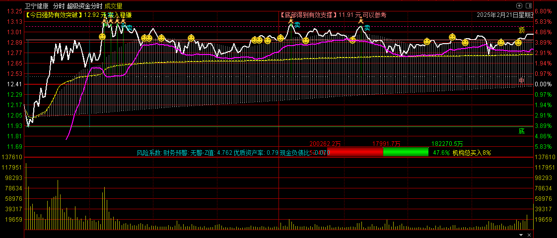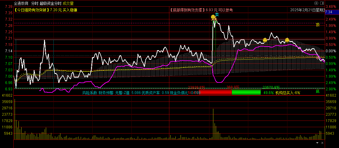 除了技术分析,该指标还整合了财务数据,如市盈率、市净率、净利润率等,并结合Z值进行财务风险预警。