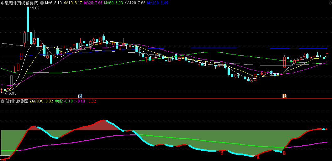 通过计算获利盘比例的移动平均线和简单移动平均线,指标从中线和短期两个视角,动态呈现市场的多空力量对比。