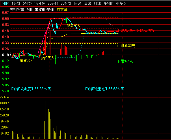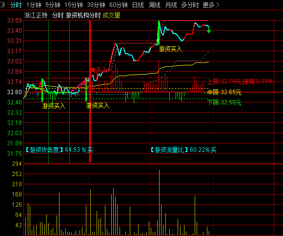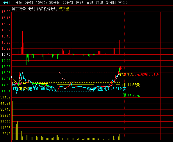 1. 游资分时线:通过黄色粗线标示游资的活跃区域,帮助投资者快速识别游资的介入点。当股价上涨时,分时线显示为蓝色,下跌时则不显示,直观反映市场的多空力量对比。