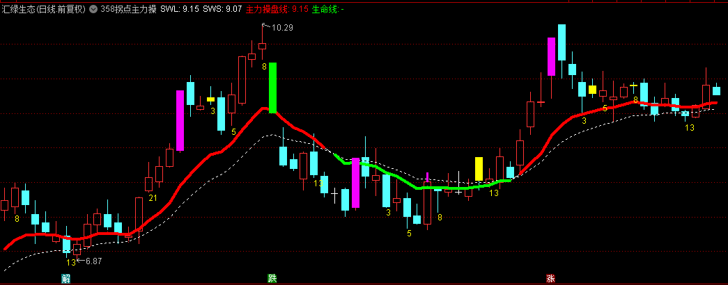 生命线(绿色):当短期均线低于长期均线SWS时,显示为绿色粗线,表明市场处于空头趋势,需谨慎操作或观望。