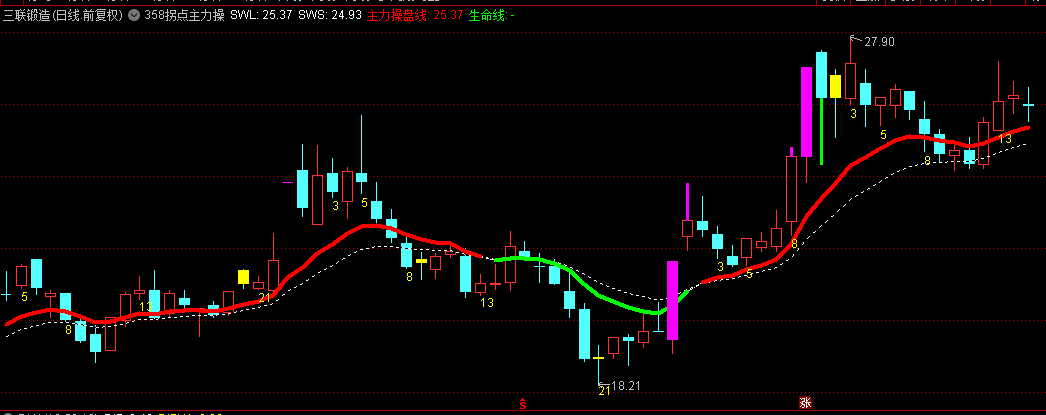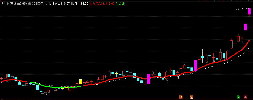 当价格连续波动并满足特定条件时,指标会在K线图上标注数字3、5、8、13、21等,这些数字代表了潜在的拐点位置。