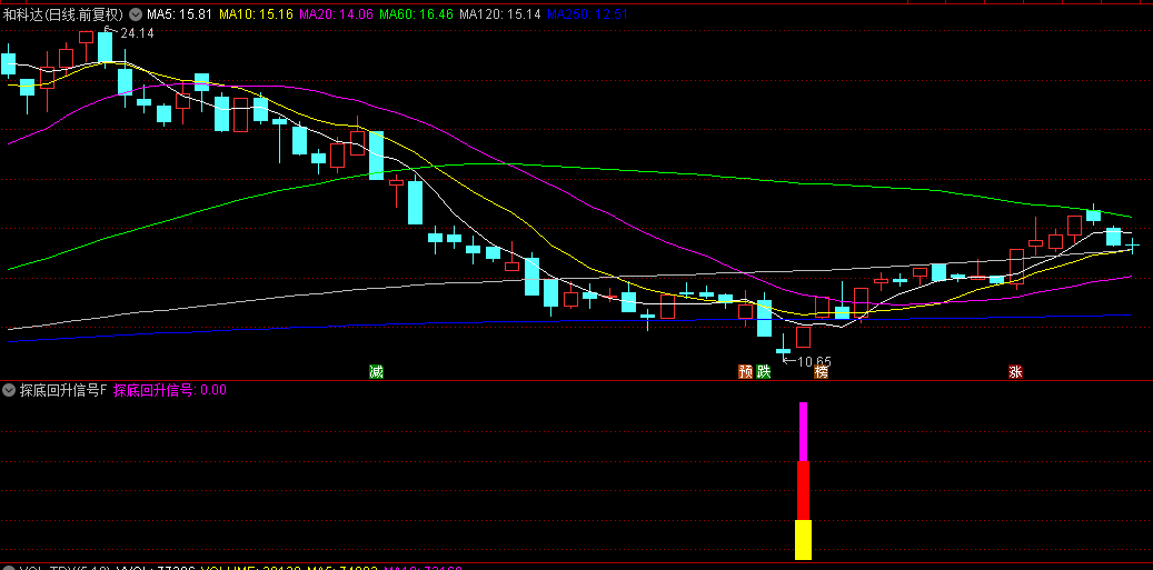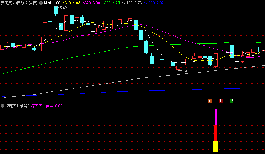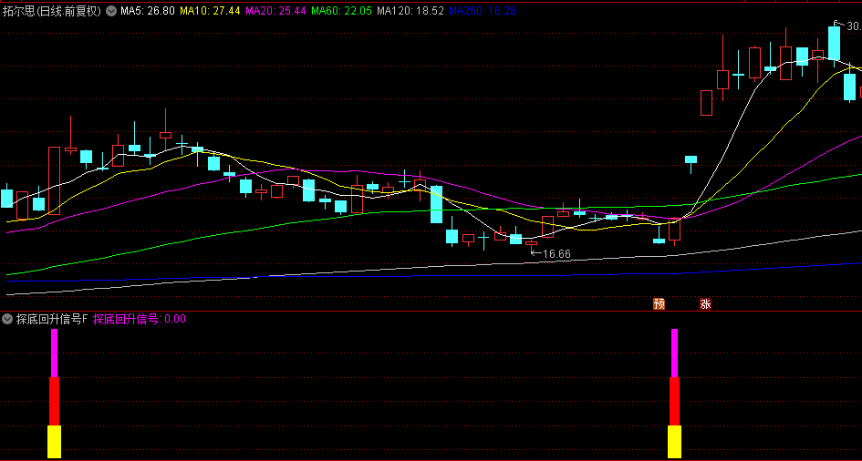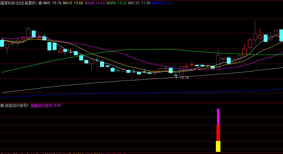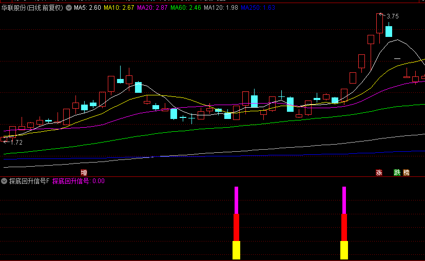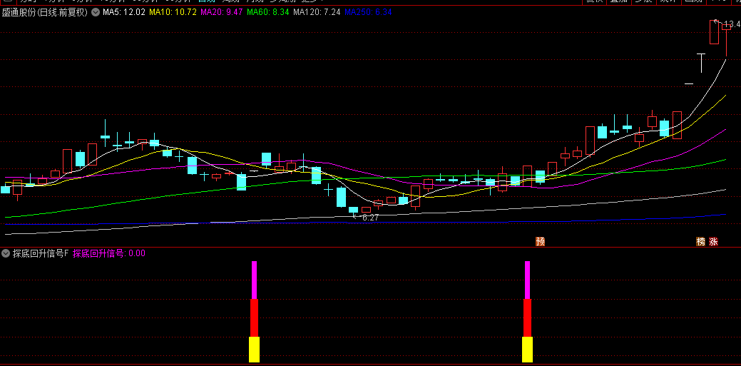 在副图中,探底回升信号通过不同颜色的柱状图展示。