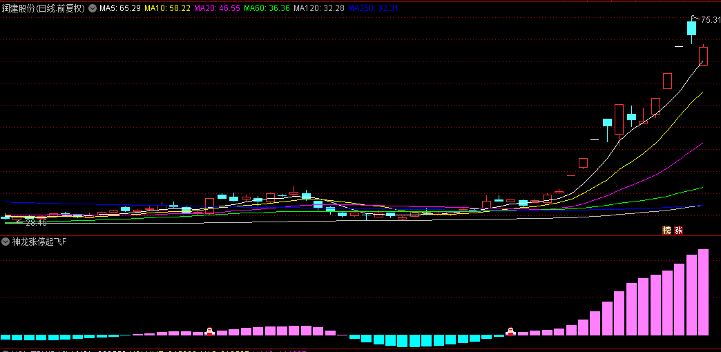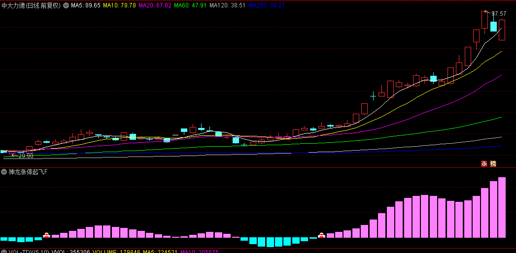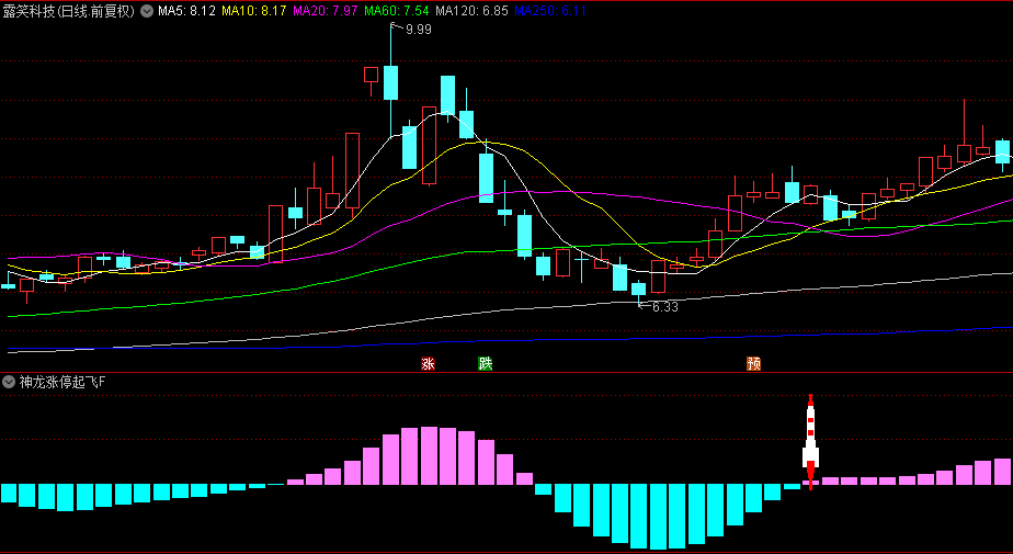 副图:通过彩色柱状图直观展示动量变化,红色和白色柱状图分别代表不同的信号强度,帮助投资者快速识别趋势变化和涨停信号。