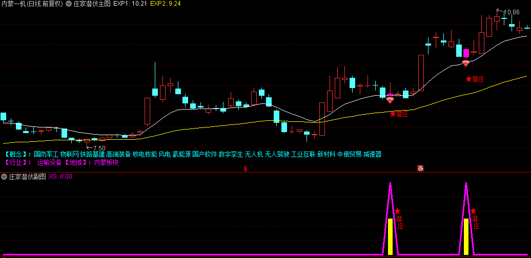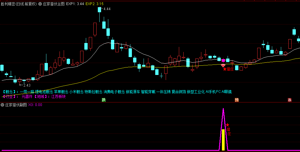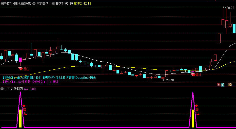 当价格突破关键均线且成交量配合时,主图会发出“潜庄”信号,提示投资者庄家可能正在低位吸筹,未来有拉升潜力。