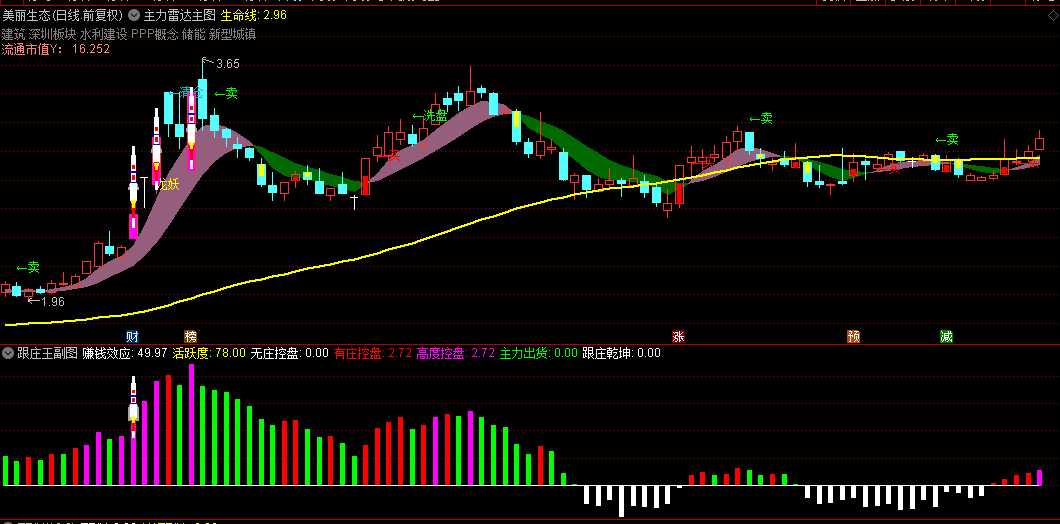 主力雷达主图指标:以直观的色带形式展示波段趋势,粉色色带代表波段持有,绿色色带代表波段休息,帮助投资者把握市场节奏。