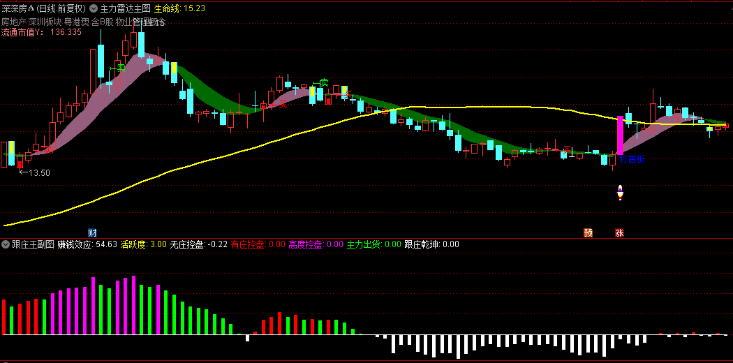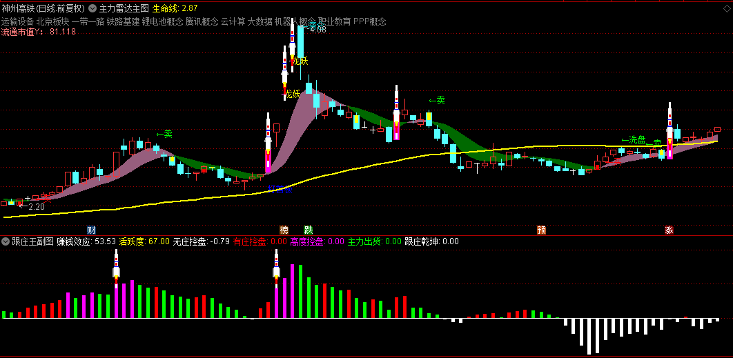 跟庄王副图指标:通过识别主力资金流向,提示“火箭”信号,辅助判断主力进场时机。