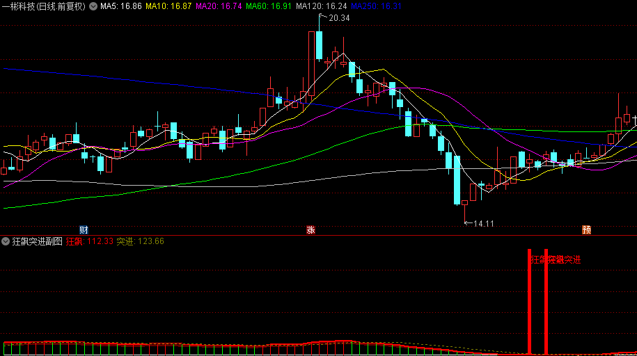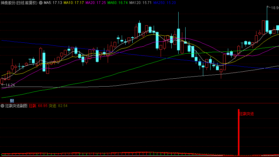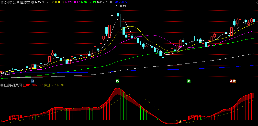 图中的两条曲线,一条是加粗的红线,当红线上穿零轴的时候,会显示狂飙突进的信号,