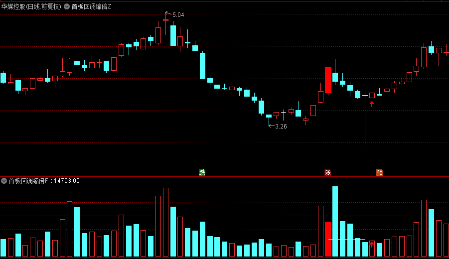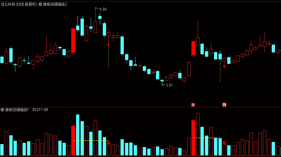 副图是成交量图,红色实体柱子是涨停首板当天的量柱,水平黄色实线,是涨停板当天量能一半的水平线,量柱中出现的红色箭头,和主图的红色箭头是对应的;