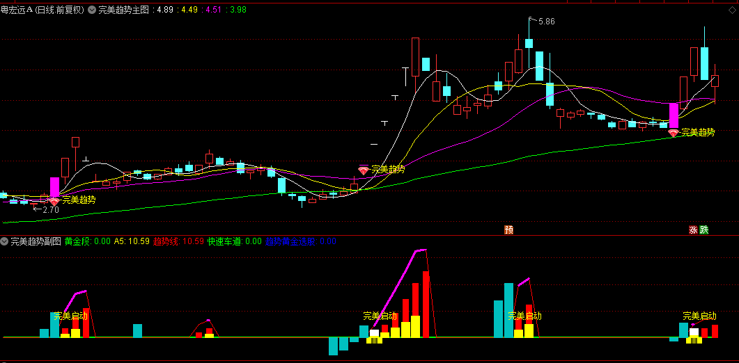 主图完美趋势通过均线多头排列和大阳线的结合,直观展示股票的强势趋势。具体指标包括: