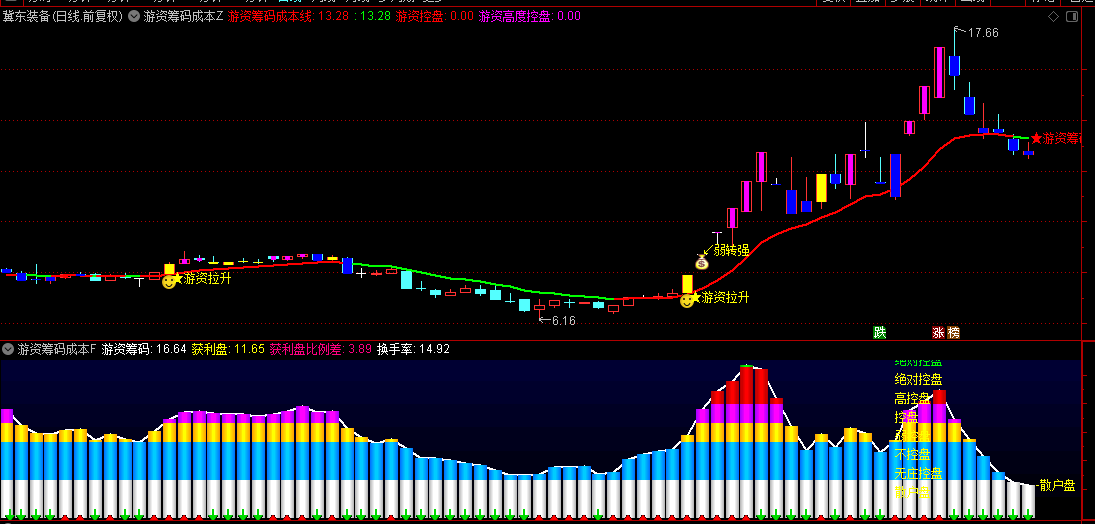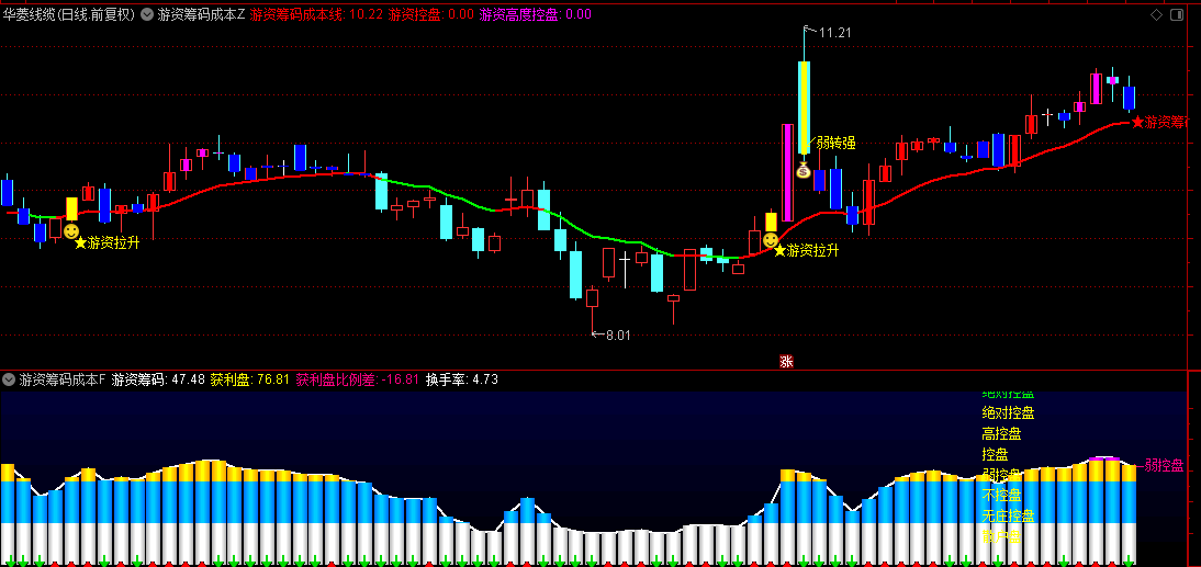 主图股价站上游资筹码成本线,出现游资拉升信号是大幅买入的信号。