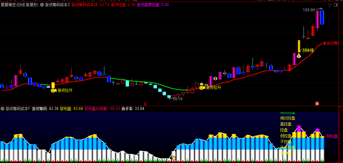 通达信【游资筹码成本】主图/副图/选股指标,潜伏游资连板妖股,出现游资拉升是买入信号!