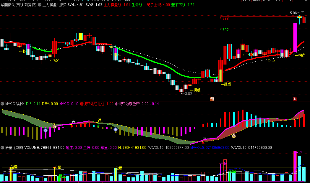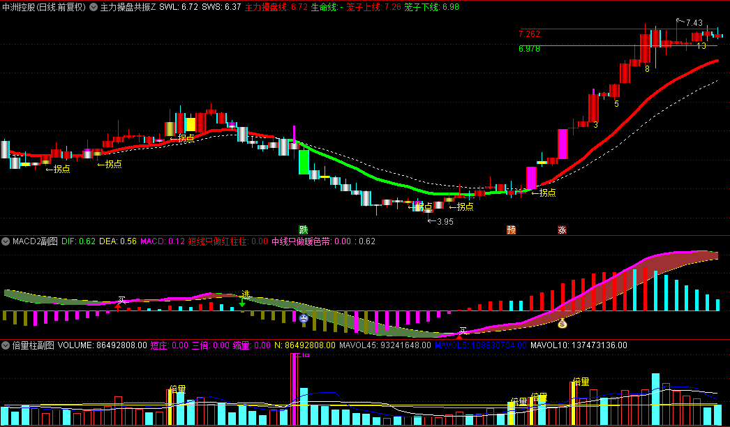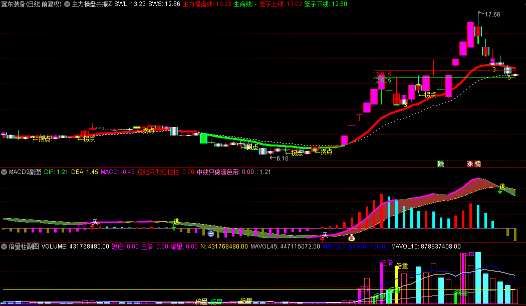 某房间的通达信【主力操盘】套装指标,一主两副图,主力操盘线+倍量柱+MACD2三合一!