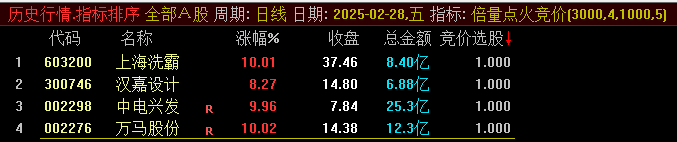 该指标系统性地整合了开盘量、竞价量比、竞价金额、换手率、倍量以及开盘涨幅等关键数据,并自动过滤ST股票,用户可根据个人需求灵活调整筛选条件。