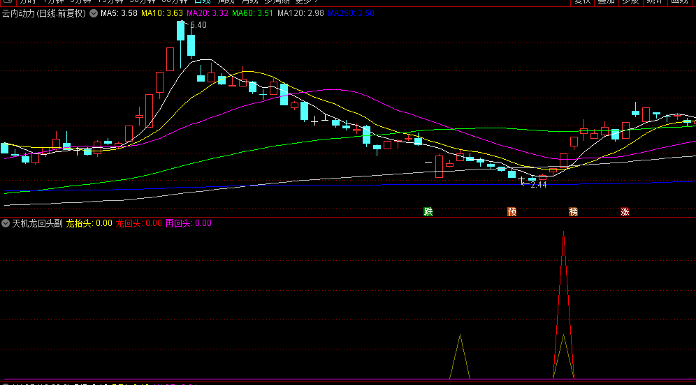 2、龙抬头:底部第一次启动信号。棕色的短尖峰信号是涨停龙回头的重要参考点,但可能不是安全的介入信号;而黄色的长尖峰信号比较安全,可作为前可作为前期强势股超跌反弹的买点,但对于非强势股来说,可能不如龙回头和再回头信号安全可靠。
