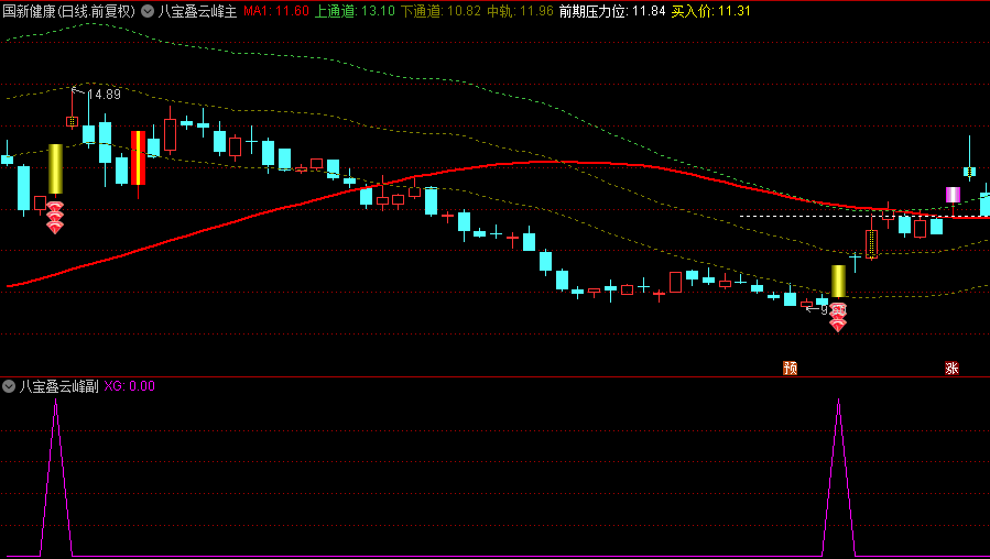 6、主图中个股涨停板,会标出三个红钻,k线变为金色,这样的信号最好,如果同时出现八宝叠云峰的B点买入信号,可以满仓干,成功率较高!