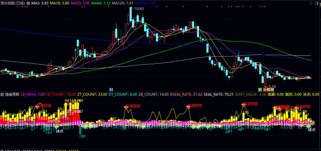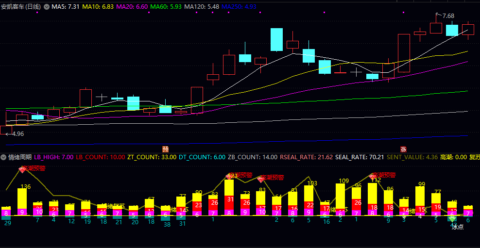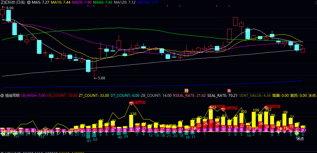 情绪高潮警示:航锦科技(000818)作为DS高标,随着DS炒作白热化,2025年2月21日情绪周期值达到85,航锦科技创下新高,龙头出现二阴,随后连续A杀后震荡,它的走势和市场情绪是高度吻合的。