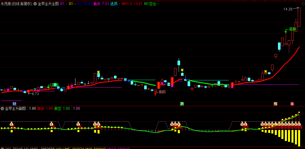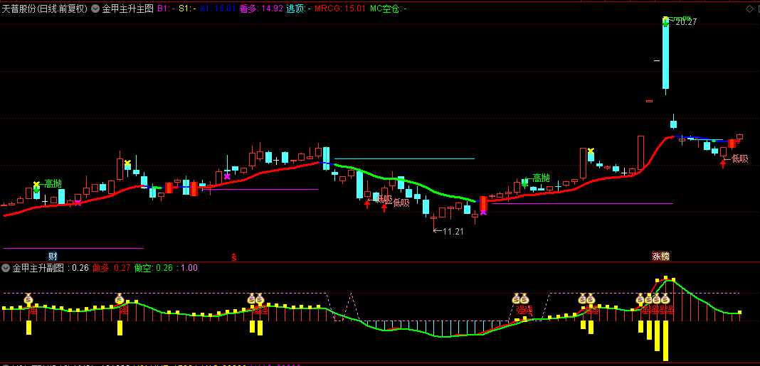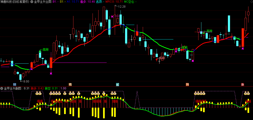 通达信【金甲主升】主图+副图+选股套装指标,抓主升及做波段的好助手,手机电脑适用!