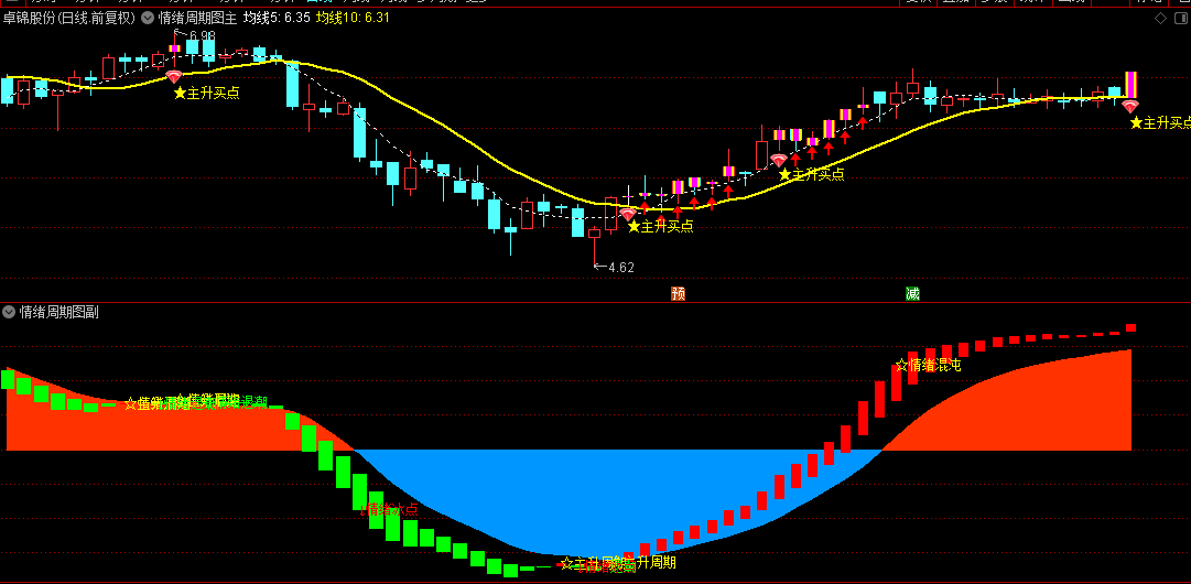4.确定性的买点是副图进入主升周期,主升出现主升买点。