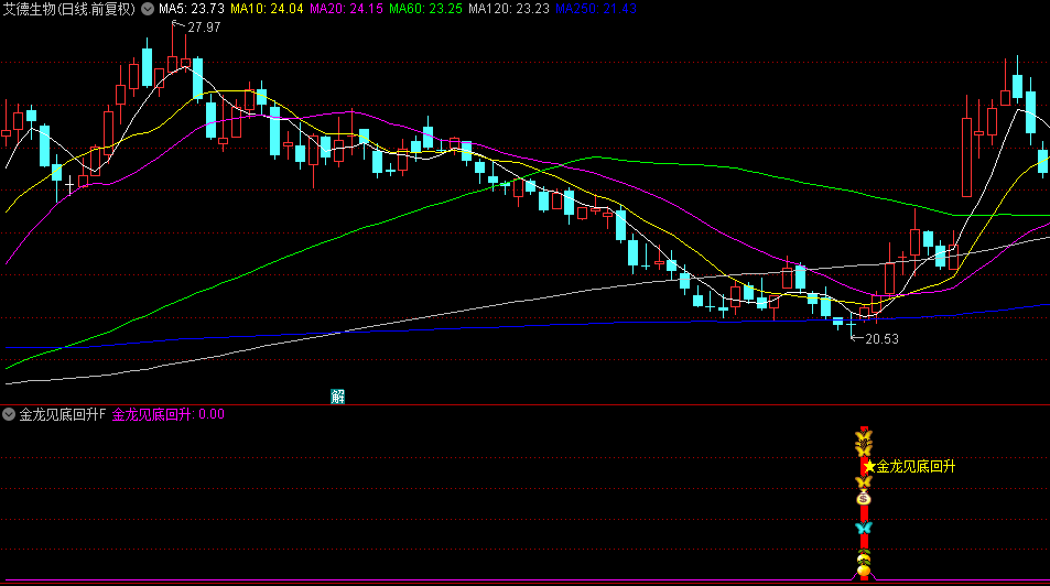 今选【金龙见底回升】副图/选股指标,适用于经过长期下跌后,进入超卖区域并出现企稳迹象的个股