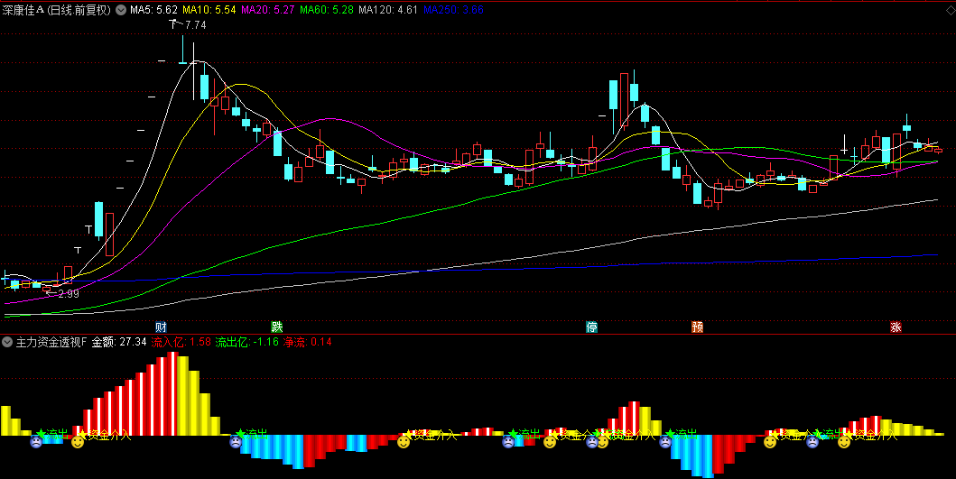 - 当净流由负转正时触发"★资金介入"(笑脸)信号;