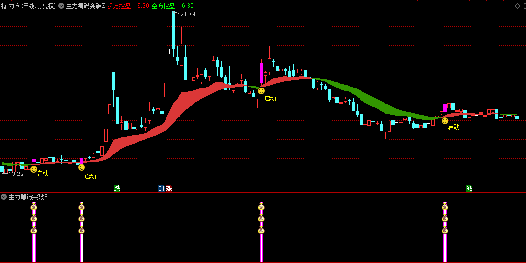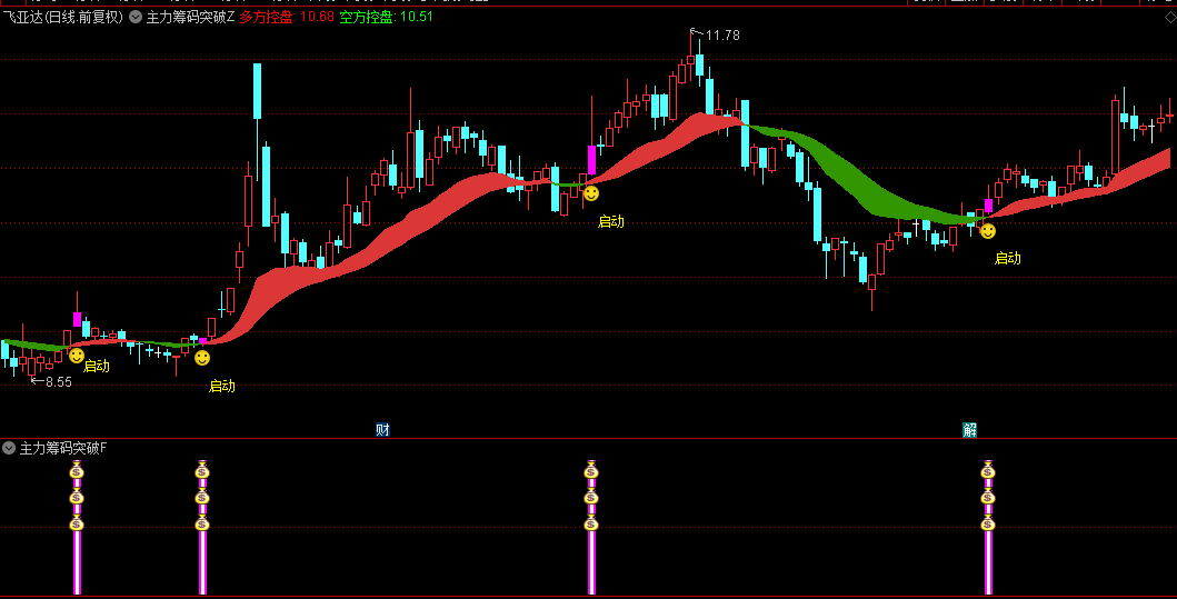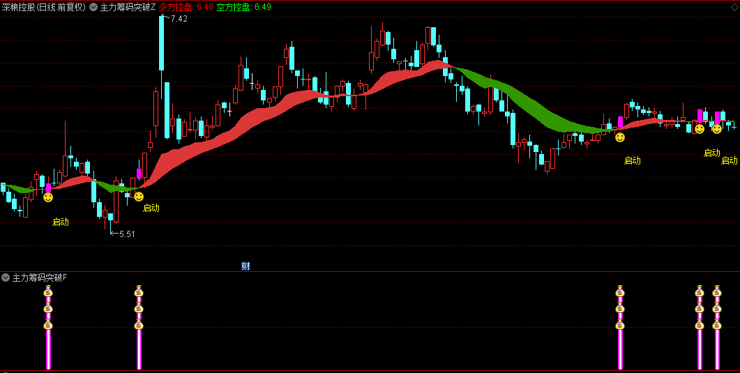 当多方控盘指标上穿空方控盘指标时,系统会生成“控盘启动信号”,并在主图上以紫色K线和笑脸图标的形式直观展示。