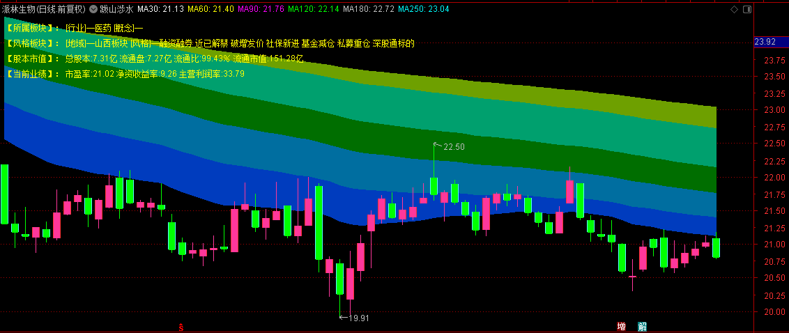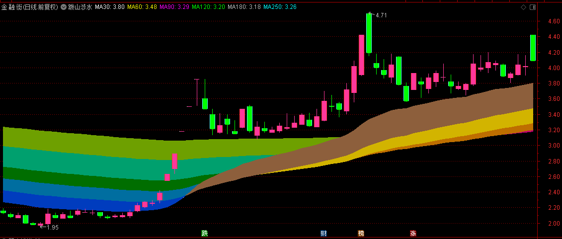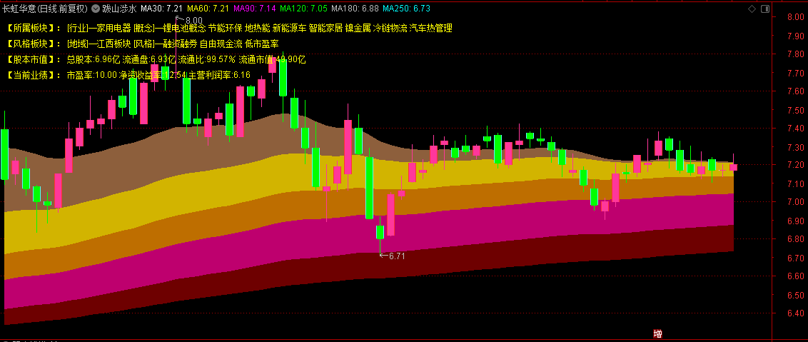 【跋山涉水】主图公式通过直观的彩色趋势带和K线形态,将个股的市场走势划分为多个阶段。