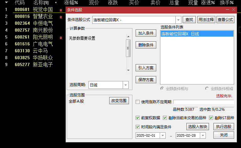 这里我量化出来的前面连板,必须是两连板以上,包含两连板,随后破位,破位的时间越短越好,这里量化了十天内破位,如果持续时间太久就没有多大意义了,因为持续时间久了,可能大主力就已经出货结束了,后面再次走出一波行情的可能性就不大;