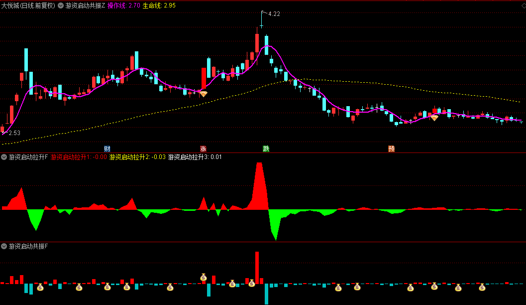 4.启动信号判断:当资金流入连续两天为正,并且短期资金线上穿长期资金线时,指标会发出“共振”信号,表明游资已经启动,股价即将进入拉升阶段。