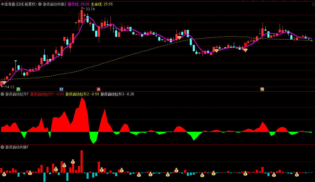 5.操作线与生命线:主图中还包含了5日均线操作线和60日均线生命线,帮助投资者判断短期和长期的趋势。当操作线上穿生命线,并且共振信号出现时,往往是较好的买入时机。