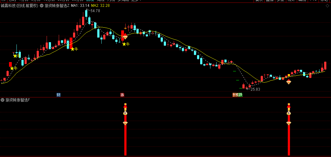 -当主图出现“智选”信号时,副图会用红色和黄色柱状线强化显示,帮助投资者更清晰地识别机会。
